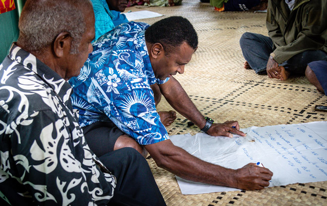Homes of Hope running an awareness training with the men and women from Vatoa Village. Credit: Tearfund New Zealand