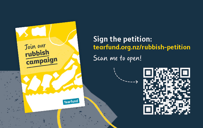 Visit www.tearfund.org.nz/rubbish-petition or scan this QR code and add your name to the list of Kiwis asking our treaty negotiators not to waste this opportunity!