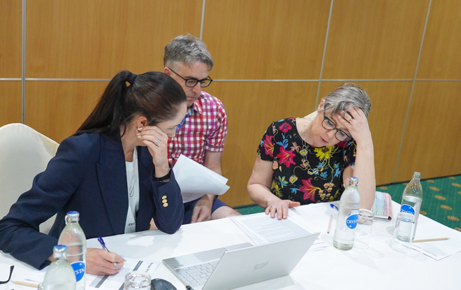 Shirley Reynolds, Peter McKenzie-Bridle, and Kate McKenzie- Bridle following a fake perpetrator’s social media trail during the investigations workshop.
