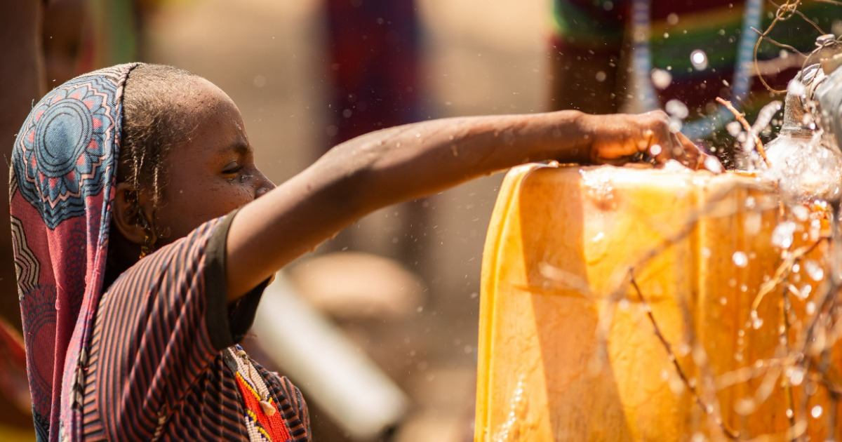 A child collects water from a water pump in Ethiopia. Credit: Chris Hoskins/Tearfund