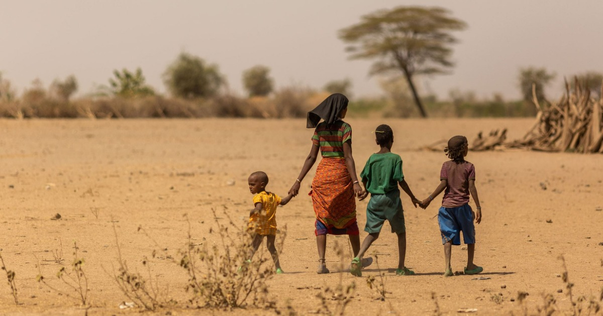 A mother walks with her children across the dry, infertile land in a drought-affected area of Ethiopia. Credit: Chris Hoskins/Tearfund