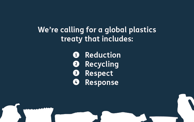 - Reduction: legally binding targets to reduce plastic production and scale-up reuse solutions
