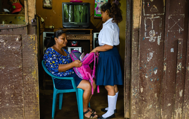 Rosario helping her daughter get ready for school. Shot for Compassion Photo/ Junieth Dinarte