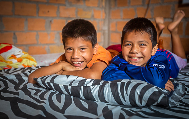 Mario (left) and his brother, Job (right) lie grinning on their new bed.