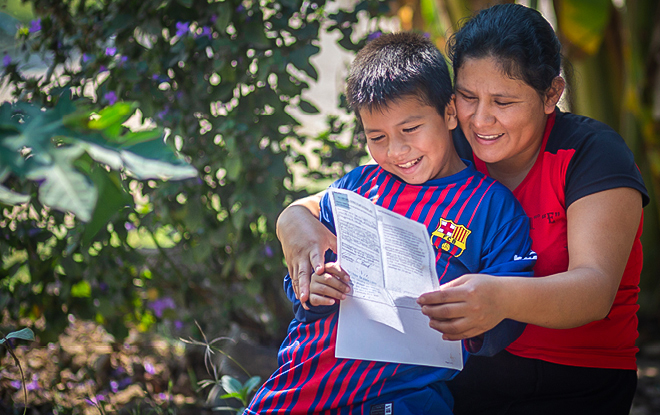Compassion’s sponsor child, Mario and his mother, Soylita, read Mario’s sponsor letter in their backyard.