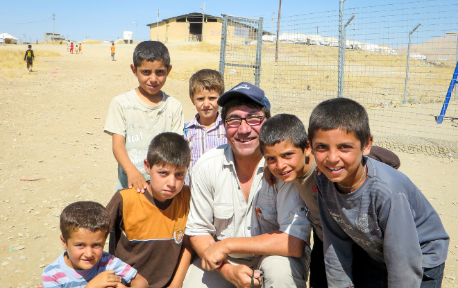 Tearfund’s Kevin Riddell in Suleimania in northern Iraq, 2014. These children are in a Syrian refugee displacement camp of Kurdish families who fled ISIS.