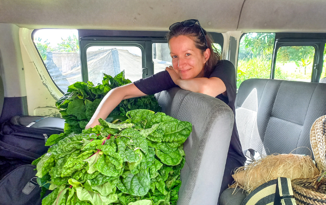 Hagar’s Andrea Herbert in The Solomons sitting behind a bunch of slippery cabbages that colleagues from their partner HOPE Trust harvested on the way back from a community visit.