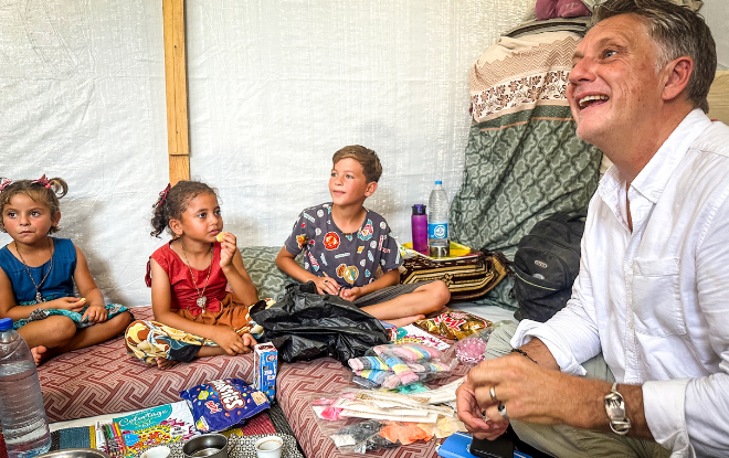 On 13 June 2024, UNICEF global spokesperson James Elder (far right) visited a family in their tent in Khan Younis, Southern Gaza Strip.