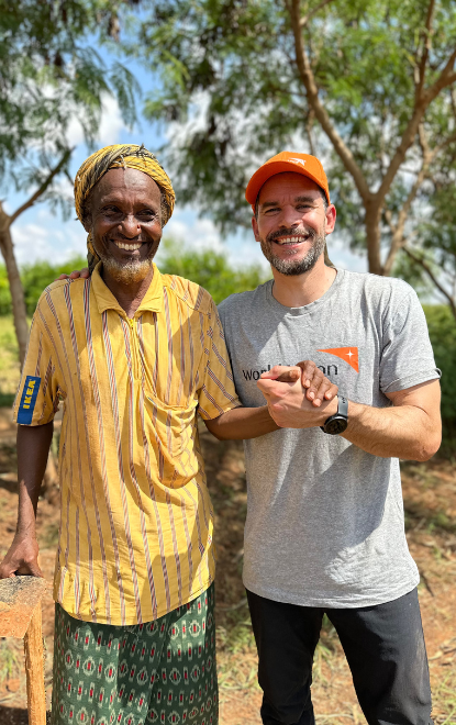 T.J Grant from World Vision with 70-year-old Nishow from Somalia.