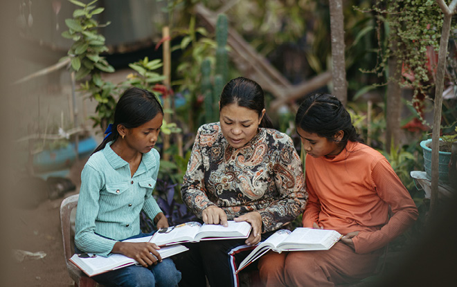 Sreyra (in a brown-patterned long-sleeve shirt and black athletic pants), Preav (13, in a light blue top), and Eming (in orange) are sitting together in chairs in the church garden area having a lesson. Photo: Compassion