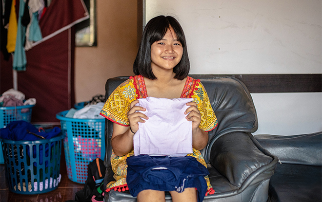 Rujira holding up her school uniform, which was a gift from her sponsor. Photo: Compassion