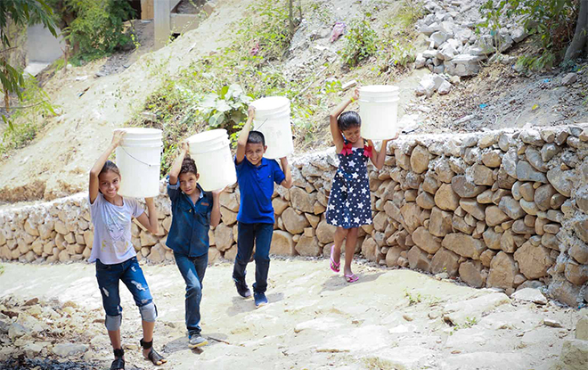 Children and families in the rural town of El Muneco in southern Honduras gather water at a well at the local church. In their hilly community, it can be quite a hike, while carrying a heavy water bucket on your shoulder!