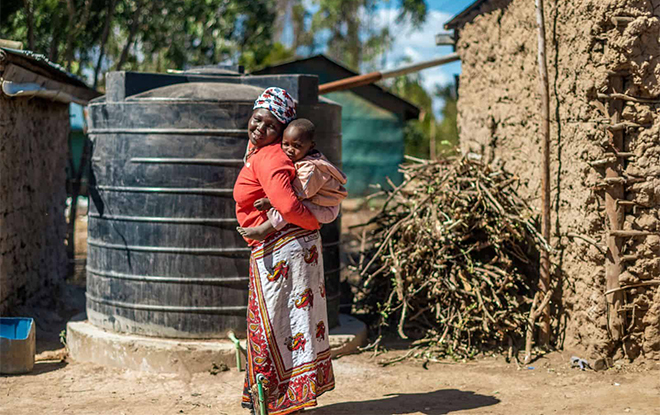 Josephine in Kenya stores water for her children in a rainwater tank. The drains and pipes from her roof channel rain into a storage tank. A few good days of rain can provide water for three months!