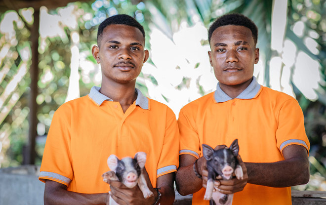 Patrikx (left) and Daniel are learning to raise pigs—a prestigious form of farming in their culture.